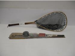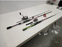 mini tackle box with fly's, Cabela's Pencil Bouncers, Telescopic Rod with reel, Extreme Stk with reel (missing top half of rod), Quantim Rod with reel, graphite series rod
