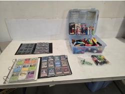 (1)binder with Pokemon cards, (1) binder with Yugi-oh cards & Yo-Kai watch medallions, tote with qty of Pez dispensers