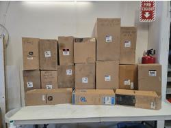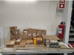 includes heavy truck wheel studs, wheel nuts, miscellaneous bolts, nuts and washers, pop rivets, lag screws, wire clamps, crimp-on hydraulic hose fittings, bin measurements 12 inch deep X 32 inch wide X 84 inch high, 10 inch deep X 26 inch wide X 79 inch high