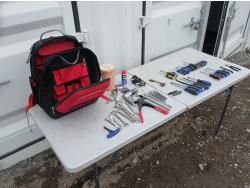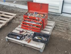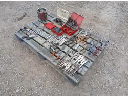 (1) Tuff-lift 12Ft, type 4 sling. (2) new 1650 lb rachet straps, (1) heavy duty rachet, drill bits, (21) piece large screw driver set, (2) lighters, (7) pieces various pliers and cutters, rubber mallet, (8) wrenches, various sockets, Allen key set, small hatchet, and various other tools and accessories.