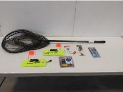 5346 Fishing Net, Planer Board, Clamp-On Oar Locks and (3) Fishing Lures