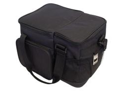 Padded adjustable shoulder strap, 2 side mesh pockets, top zipper for easy access, <br/>front panel w/buckles, leak resistant liner, holds 20 cans, metal bottle opener, size 14” x 12” x 8”, capacity 22 liters