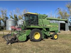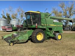 1998 John Deere 914 14 ft pick-up header, variable speed reel, fore & aft, reverser, rock trap, chaff spreader, fine cut chopper/spreader, grain tank extensions, 18 ft auger, A/C, buddy seat, 30.5-32 front tires, 16.9-26 rear tires