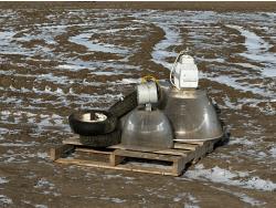 120V fan, mop bucket, bottle jack, drain snake, filing cabinet