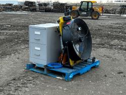 32 inch industrial fan, mop bucket, bottle jack, drain snake, filing cabinet