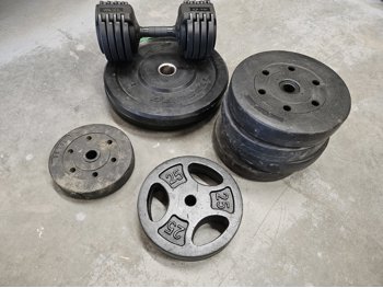 (1) 10 - 50 lb adjustable dumbbell, (4) 25 lb plates, (4) 20 lb plates, (1) 10 lb plate