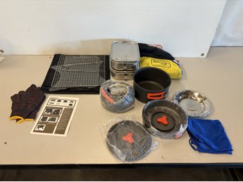 Pots, kettle, metal lunch boxes, first aid kit