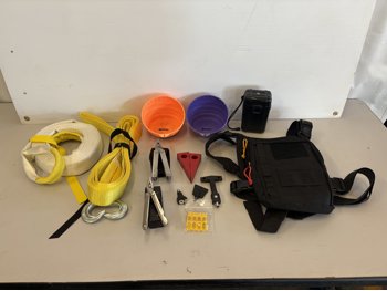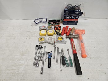 (9) tape measures, (5) unused safety glasses, (3) socket wrenches, (7) socket extensions, (2) mallet/hammer, (4) handles