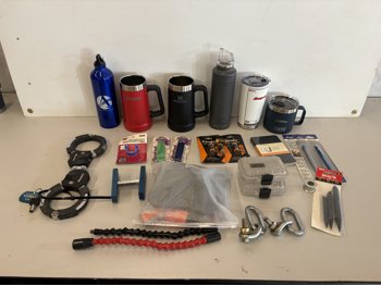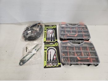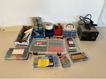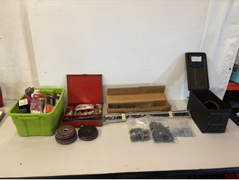Assorted grinding disks, plastic push pins, cotter pins, wrench holders, specialty tools, screws, drill bits