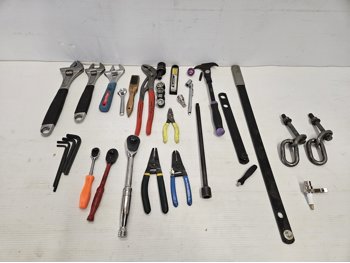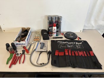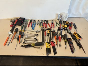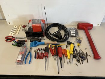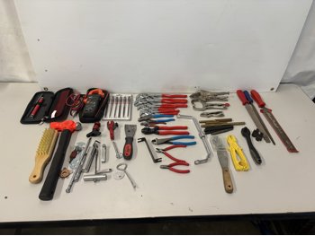 Milwaukee hand drill, klein tool cl390 volt meter, plyers, cutters, vice grips, ratchet, files, glass removal tool, hammer, brushes