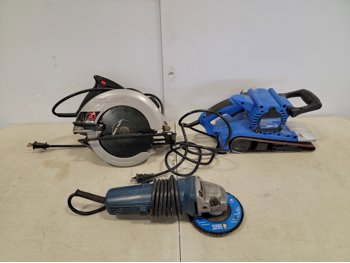 Skilsaw 7-1/4 Inch Circular Saw, Powerfist Belt Sander and Ryobi Angle Grinder