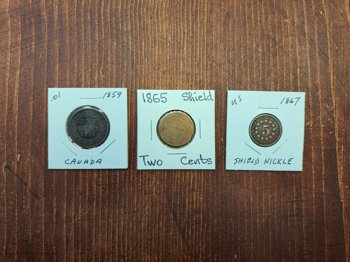 1859 Canadian Penny, 1865 US Shield Nickle & US Shield 2 Cent