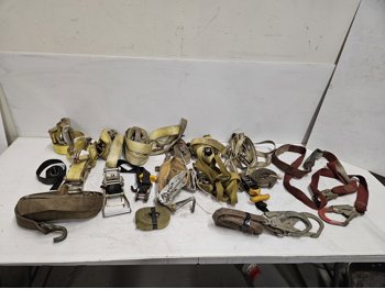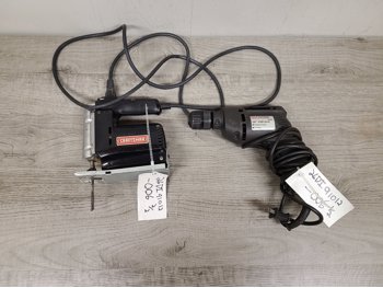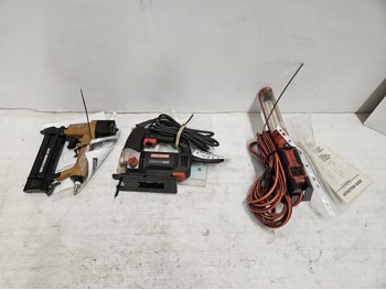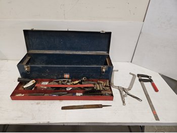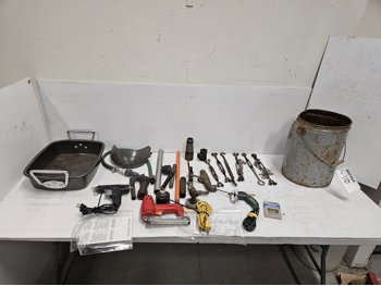 (1) hand drill (1) pipe wrench (1) screw driving pin (1) cable pullers (1) c clamp (2) metal cutters