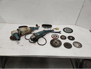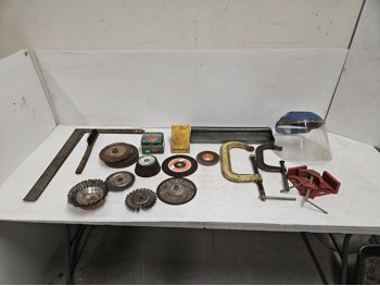 wire wheels, wheel chocks, large c-clamps, tool tray, mask