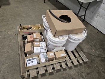 (4) Pails of 50/50 Recotherm transfer fluid, Hose crimper, hose repair splice & hose end fittings with crimp rings, (2) temperature gauges, (2) pressure gauges, (1)_ strobe light, (1) burner control, nozzle, qty of hose, brass pump, reel brake, miscellaneous other repair parts