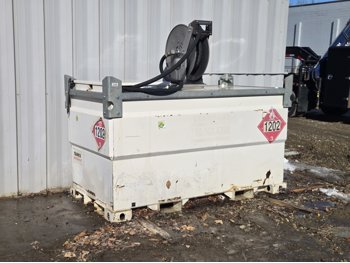 12volt pump with Handy Reel, hose & nozzle, 12 volt battery included, forklift pockets, diesel was last in it, very good condition