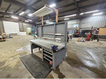 wired with plugs & light, 4 drawer tool box, (2) bolt bins (1) standard (1) metric with lots of bolts, vice mounted, rubber standing matt