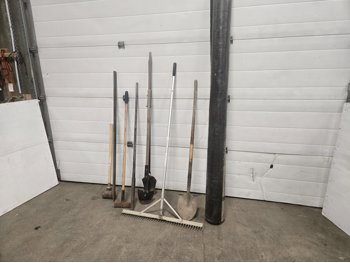 landscape rack, post maul, (2) long crowbars, post hole clean out tool, spade