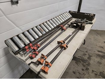 (1) 60 inch roller set, (5) pipe clamps, part of pipe bender, lathe steady rest, milling machine vise