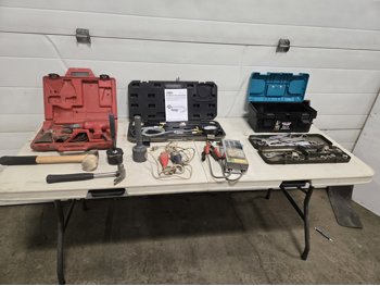 tubing flaring kit, valve spring compressor, brake drum caliper, cylinder hones with extra stones, Tack/Dwell meter, unused 2 inch pipe tap, OTC battery load tester, pressure gauge