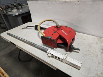 230 volt 3 phase, (2) wands, qty of hoses, shop built overhead arm, (2) floor washer bars on casters, chimney pipe, on wood pallet, nozzles and miscellaneous parts, Note this machine looks ugly but it works very well, pump just had a service kit put in.
