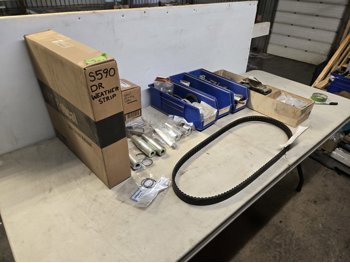 unused door weather stripping, qty of unused Loader pins and bushings, unused main hydraulic drive belt, miscellaneous parts
