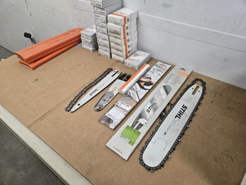(6) 61PM X 44 Chains, (9) 33RS X72 chains, (7) 23RS X 67, (1) 23RS X 62, (1) 16 inch 3005-000-7013 bar, (2) 16 inch 3003-118-6613 Bars (10 with chain, (1) box of 11/64 files, (2) used craving bars