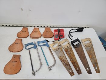 (6) Hand Saws, (5) Kuny's Wrench Holders and Milwaukee Battery Charger