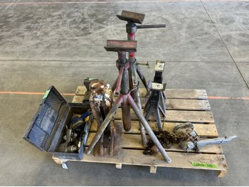 pipe stands, jack stands. 5 inch vise, Simplex house jack, air tools, chain come-a-long