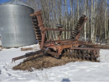 front: 8 inch spacing smooth 23.5 inch discs, rear: 9 inch spacing smooth 20.5 inch discs, floating hitch, scrapers, duals main frame and wings, 11L-15 main frame tires, 8.5L-14 wing tires