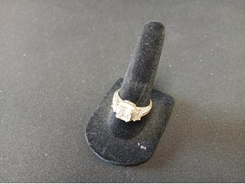 Sterling Silver (925) band with (3) cubic zirconia stones. size unknown.