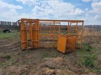 10 ft wide, 13 ft long, auto catch head gate, hydraulic pen close, calf basket, Global Q/A mounts