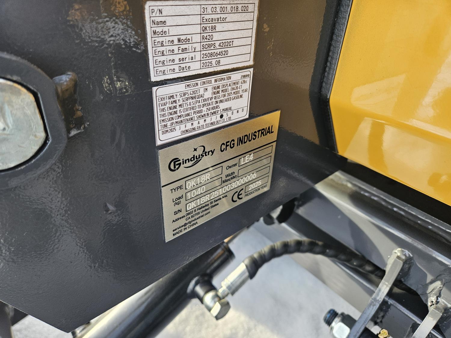 Open station, pilot controls, 420cc gas engine, 15 inch dig bucket, hydraulic thumb, 2 Ft 8 inch stick, backfill blade, 7 inch rubber tracks