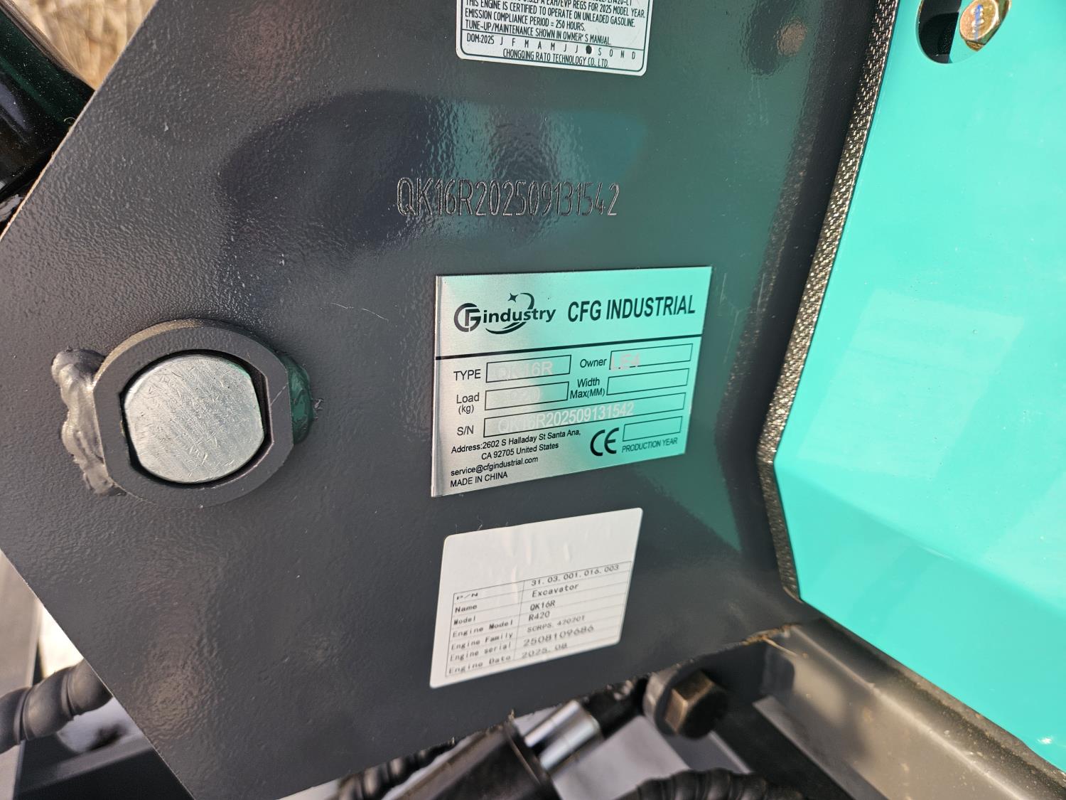 Open station, gas engine, 15 inch dig bucket, manual coupler, hydraulic thumb, 2 Ft 8 inch stick, backfill blade, 7 inch rubber tracks