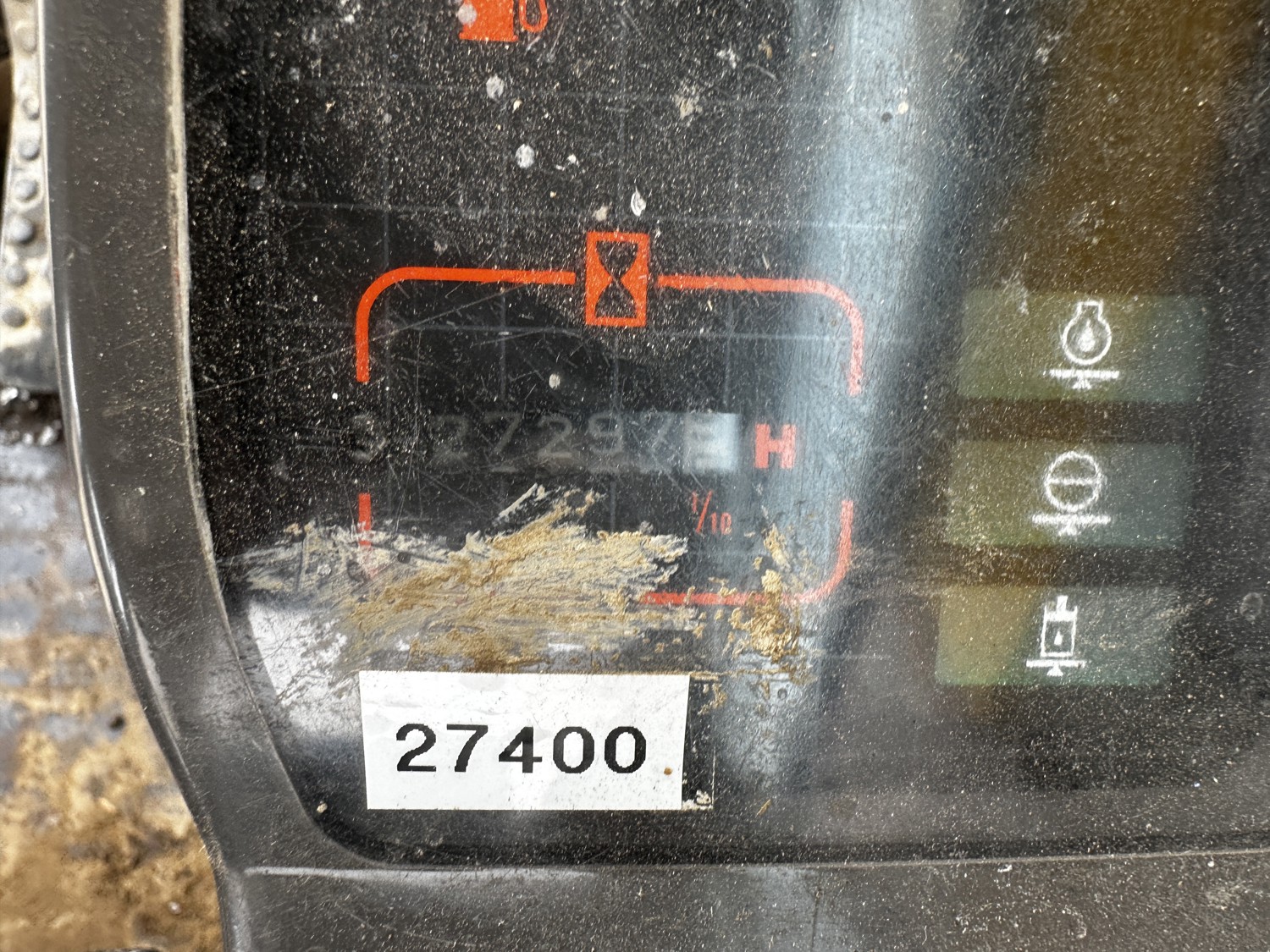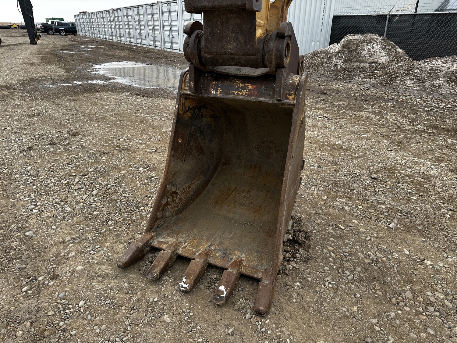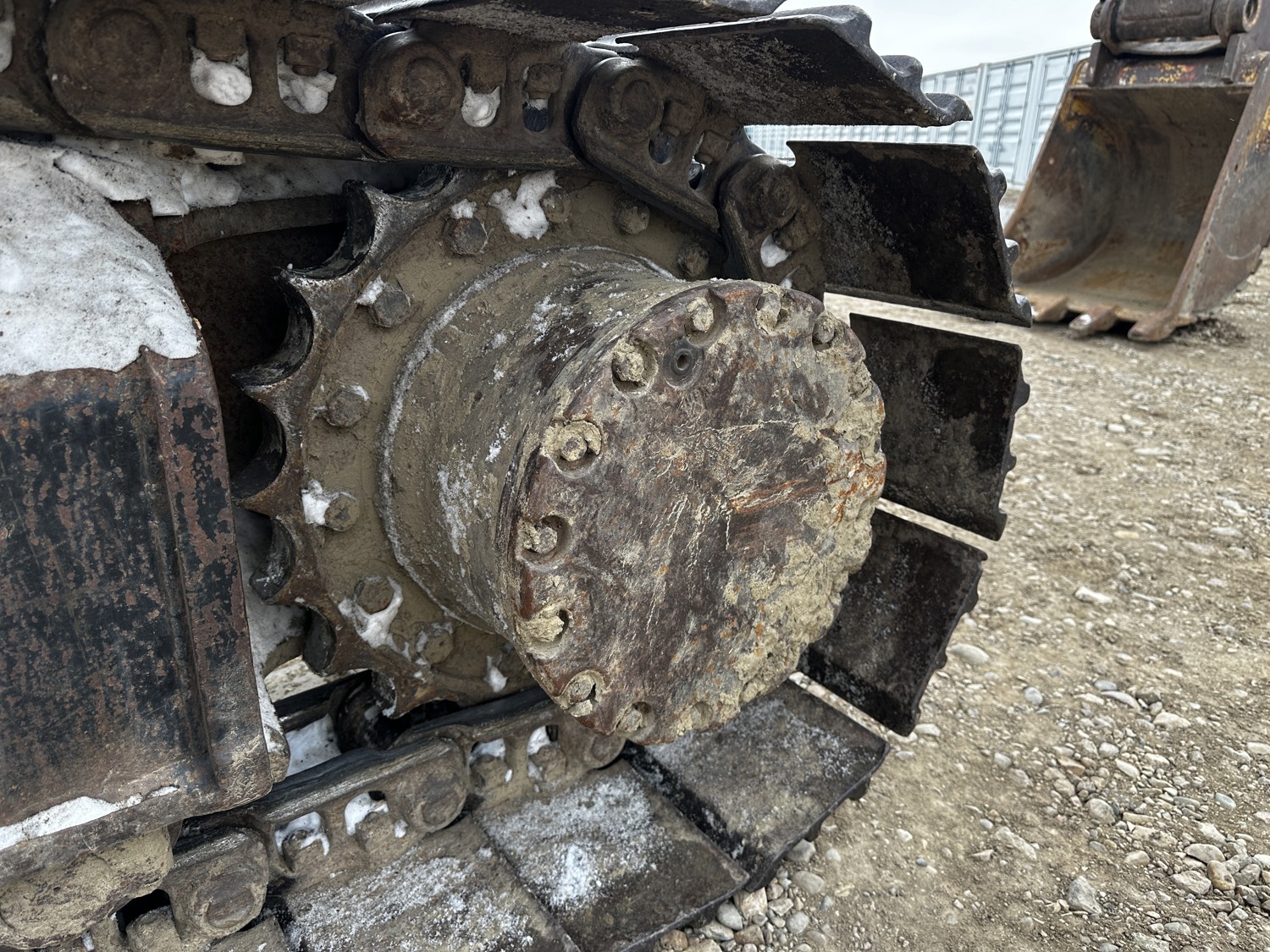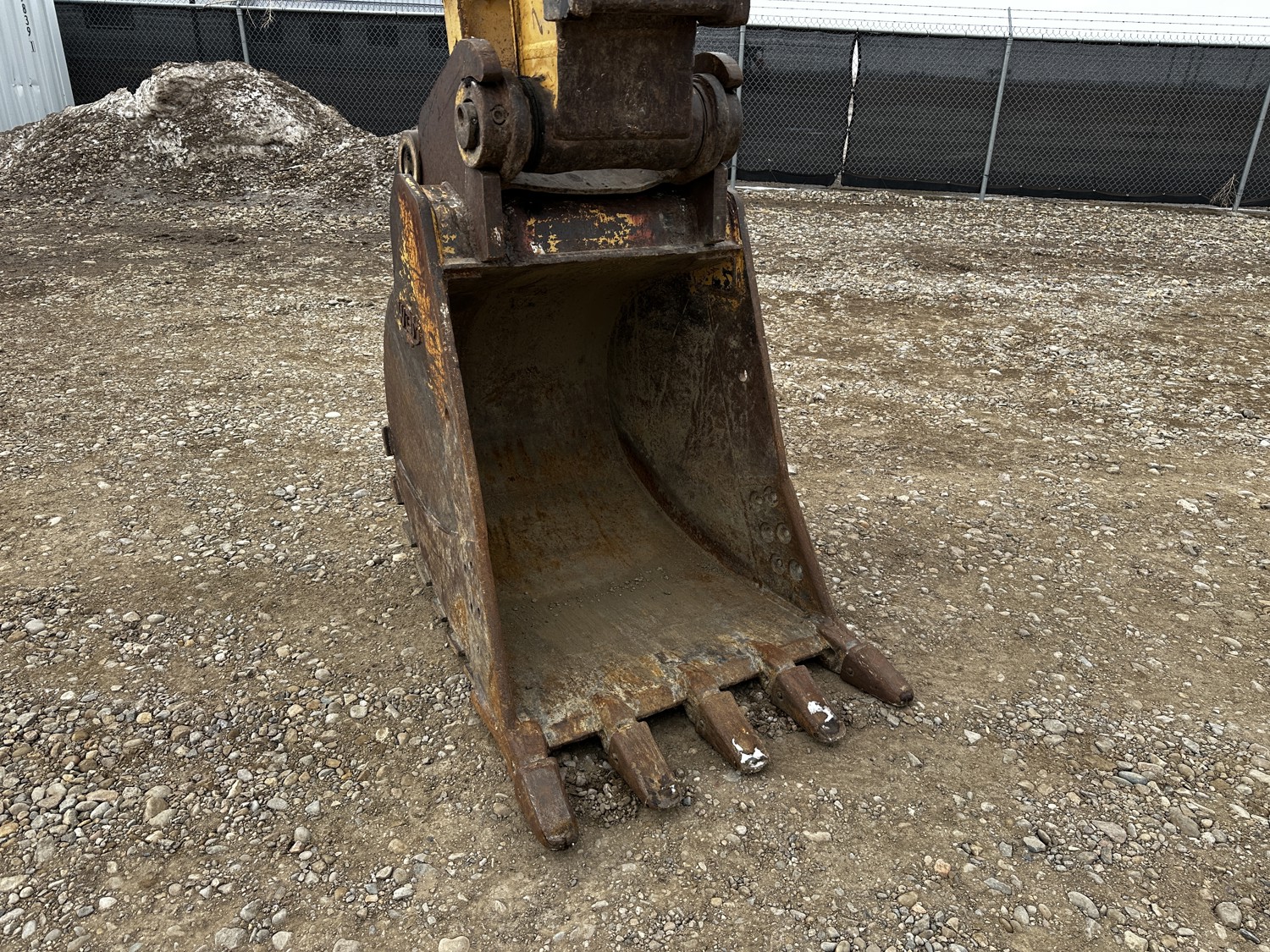 Enclosed cab, A/C, 33 inch dig bucket, manual coupler, 8 Ft 3 inch stick, auxiliary hydraulics , 24 inch track pads, triple grousers