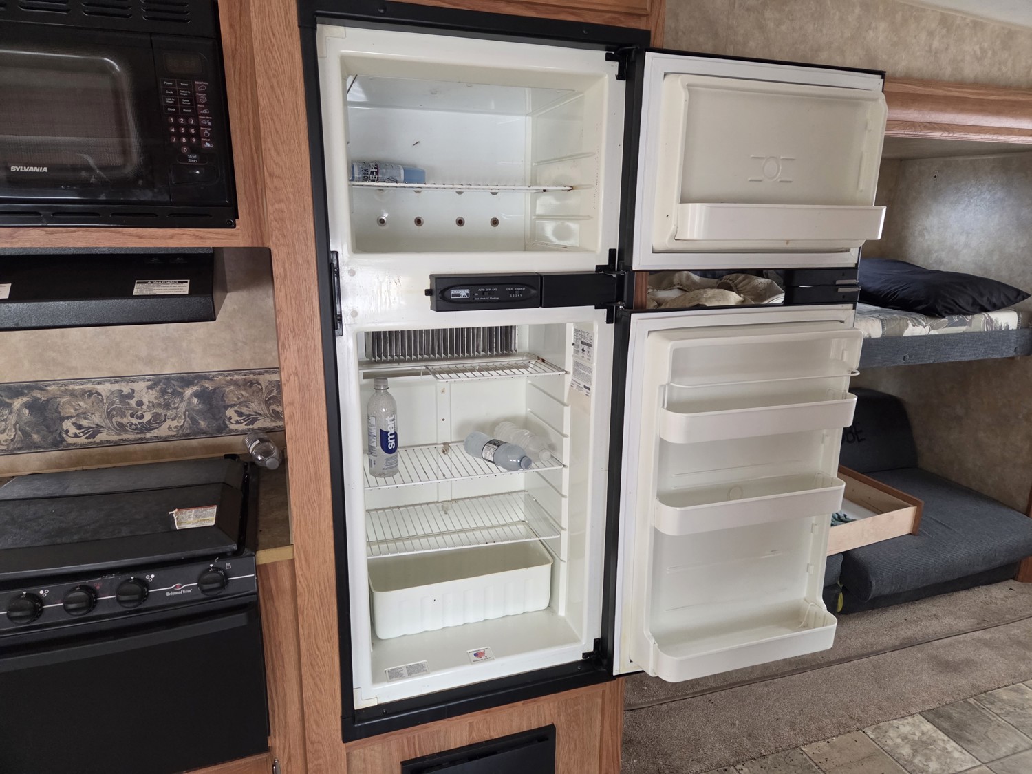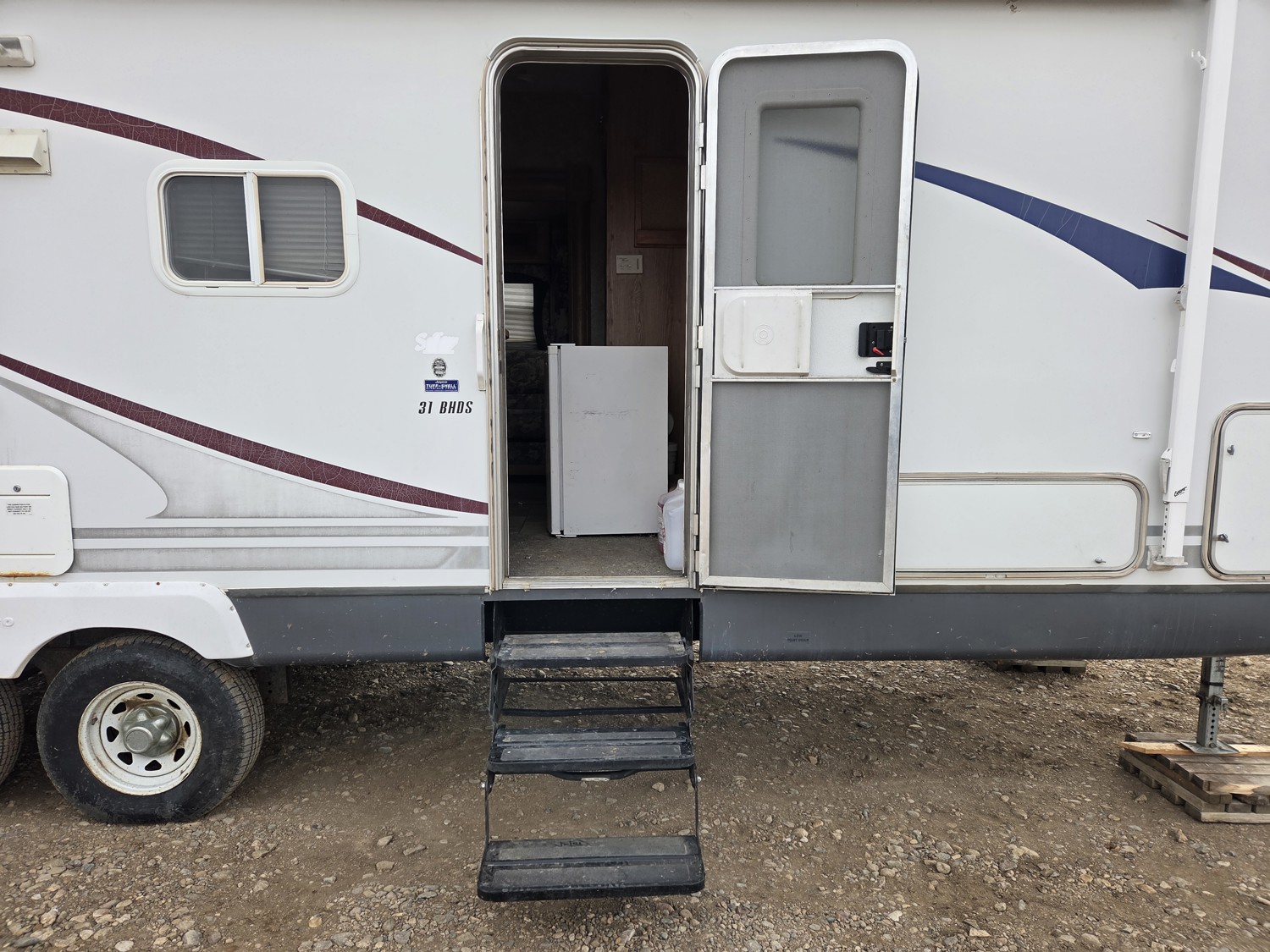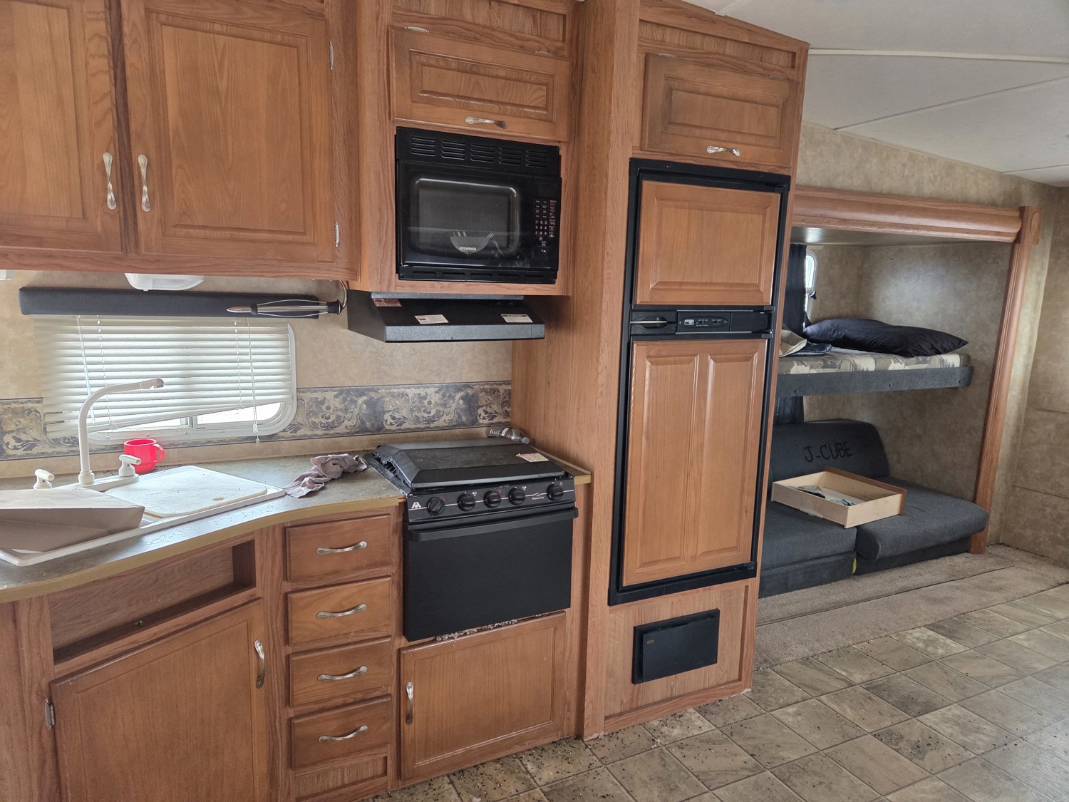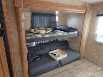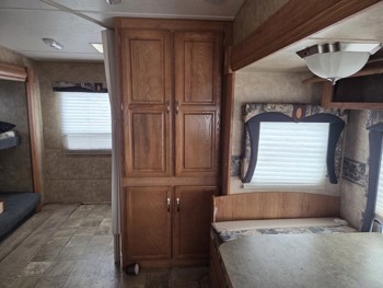 Sleeps 7, stove, fridge, microwave, master bedroom, bunk beds, A/C, outdoor shower, 2 slides, manual awning, spring suspension, electric brakes, ST225/75R15 tires