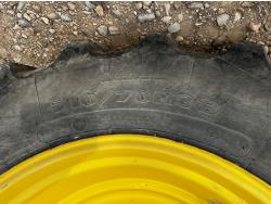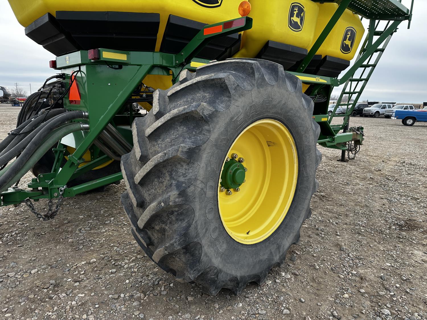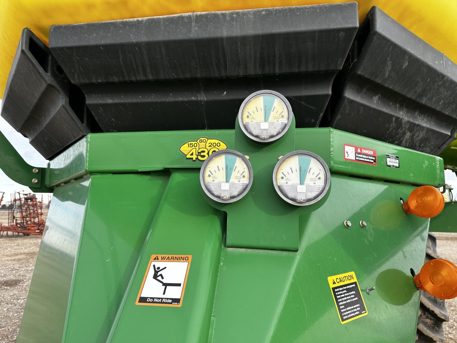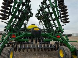 10 inch spacing, single shoot openers, 4 inch steel packers, mid row banding, Air Cart: 3 compartments, 12 inch loading conveyor, single fan, 710/70R38 tires
