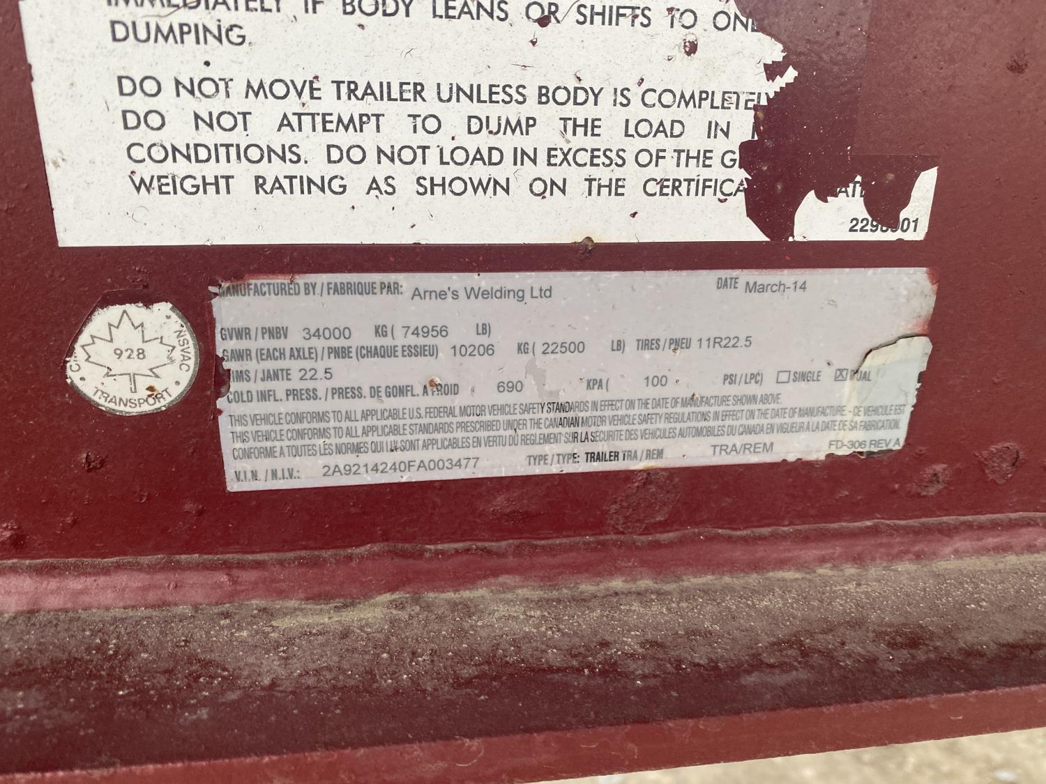 2015 Arnes 27 Ft Quad Axle Wagon End Dump Trailer