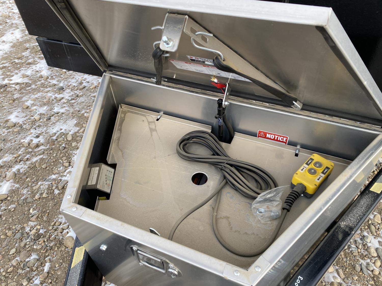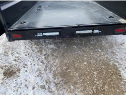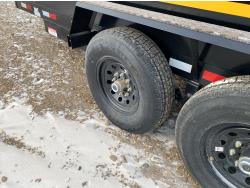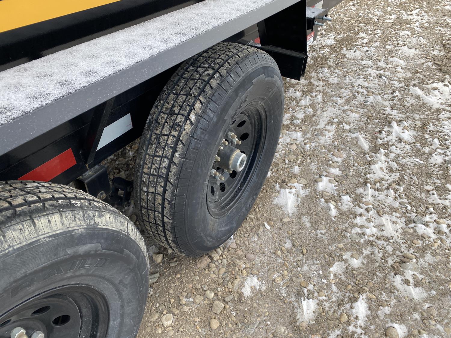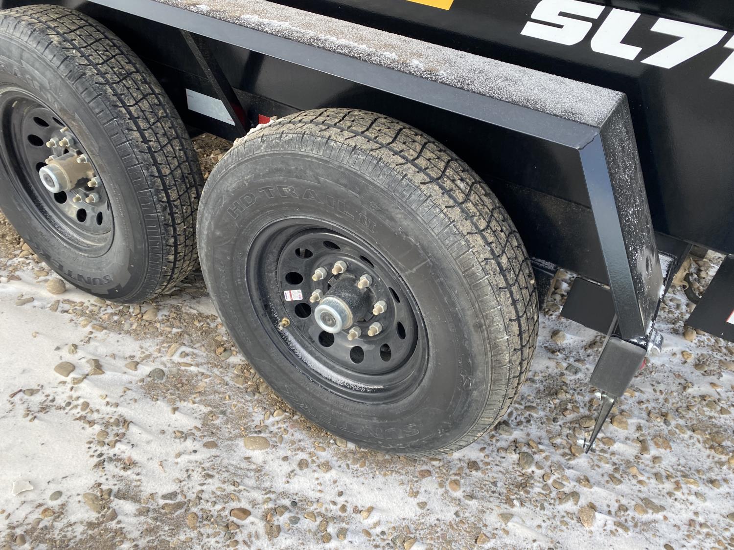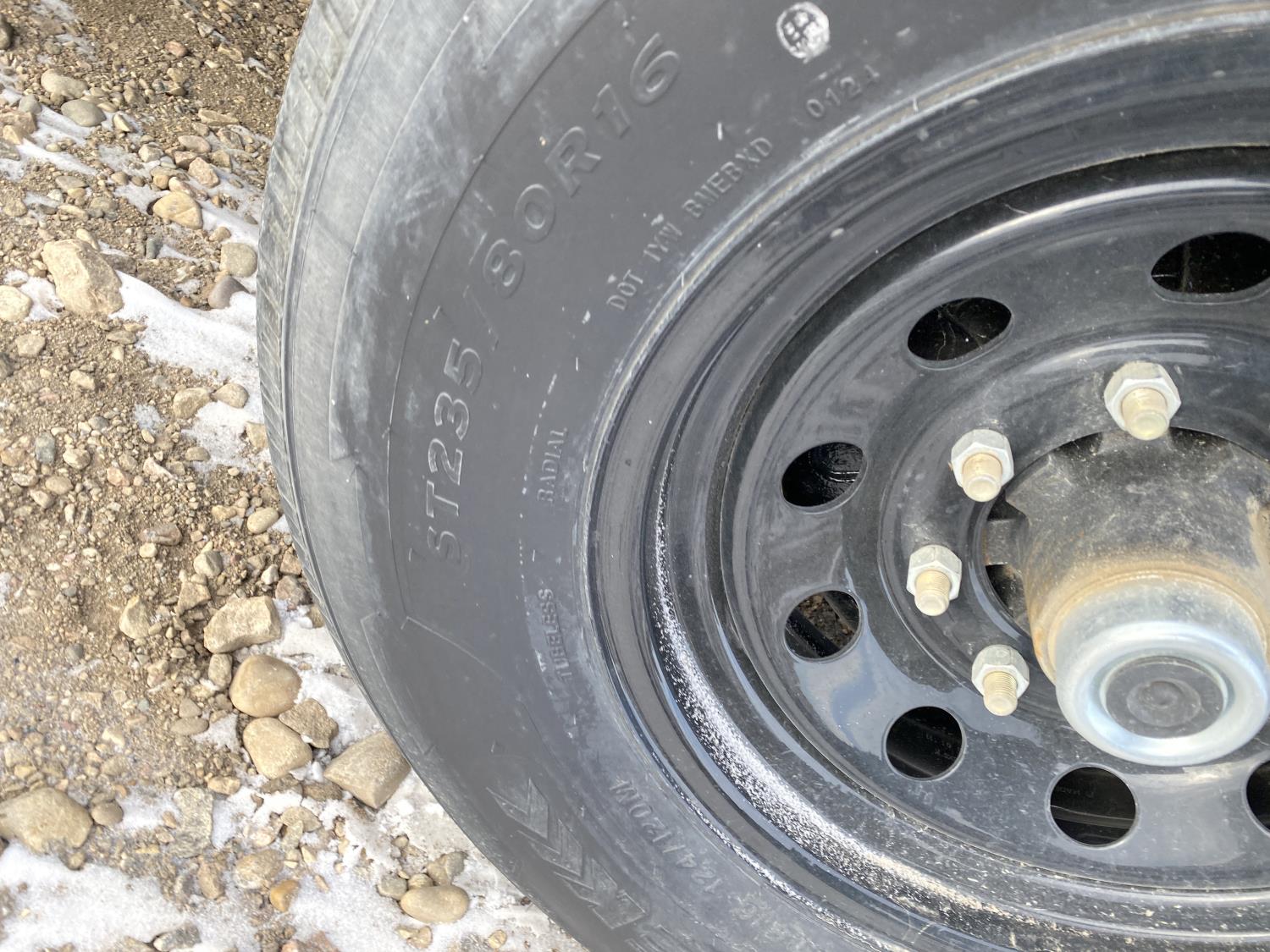 2-5/16 inch Ball hitch, 7 ft box width, 26 inch side wall height, roll tarp, ramps, corded lift remote, electric brakes, spring suspension, 7,015 lb axles, 235/80R16 tires