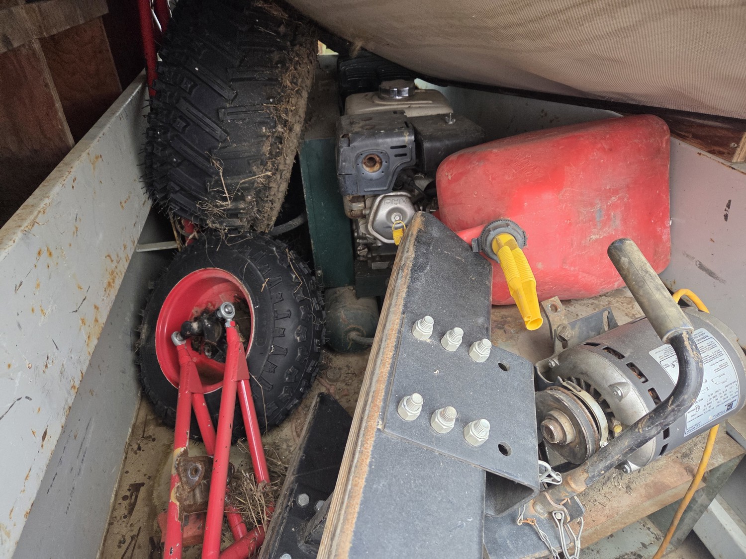 4 ft wide base. 6-1/2 ft upper width, 57 inch height. Includes cot, jerry can, tires, generator, motor, hitch