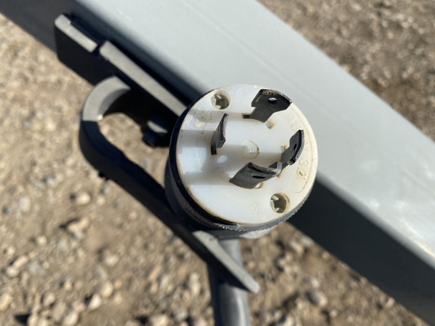 Baldor 20 HP 230/460 3 phase electric motor, hand winch lift, flex spout, 225/75R15 tires