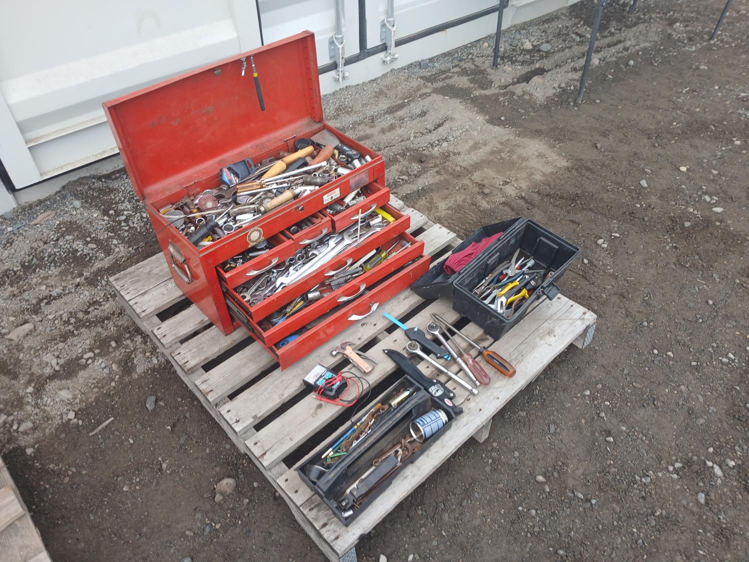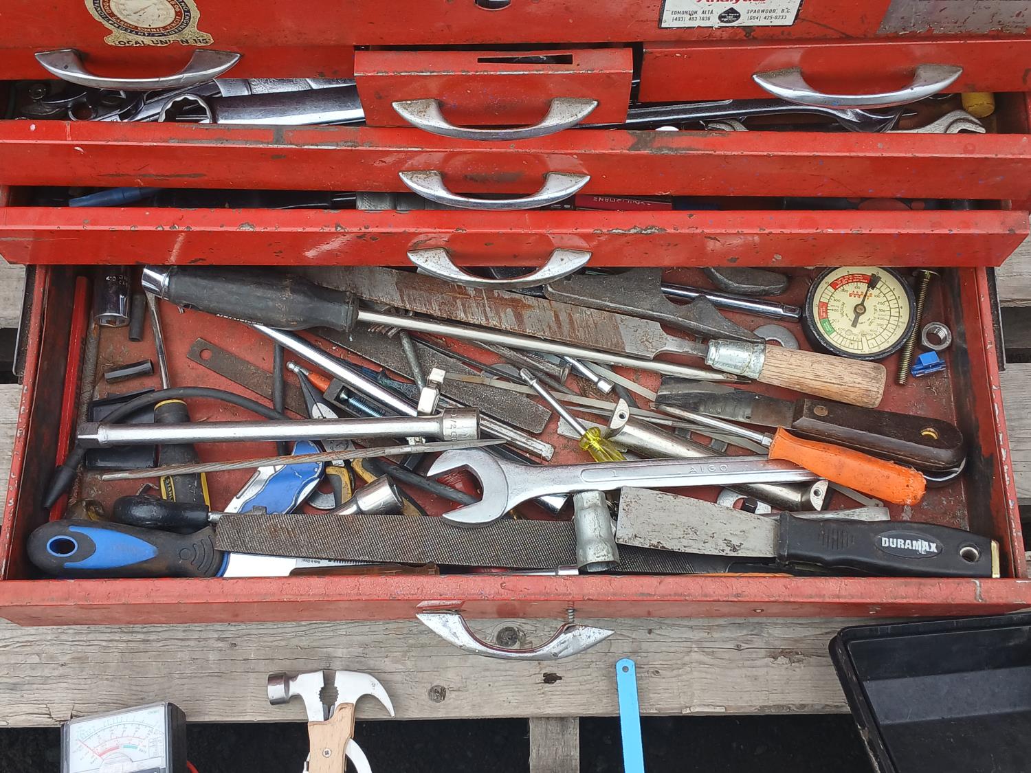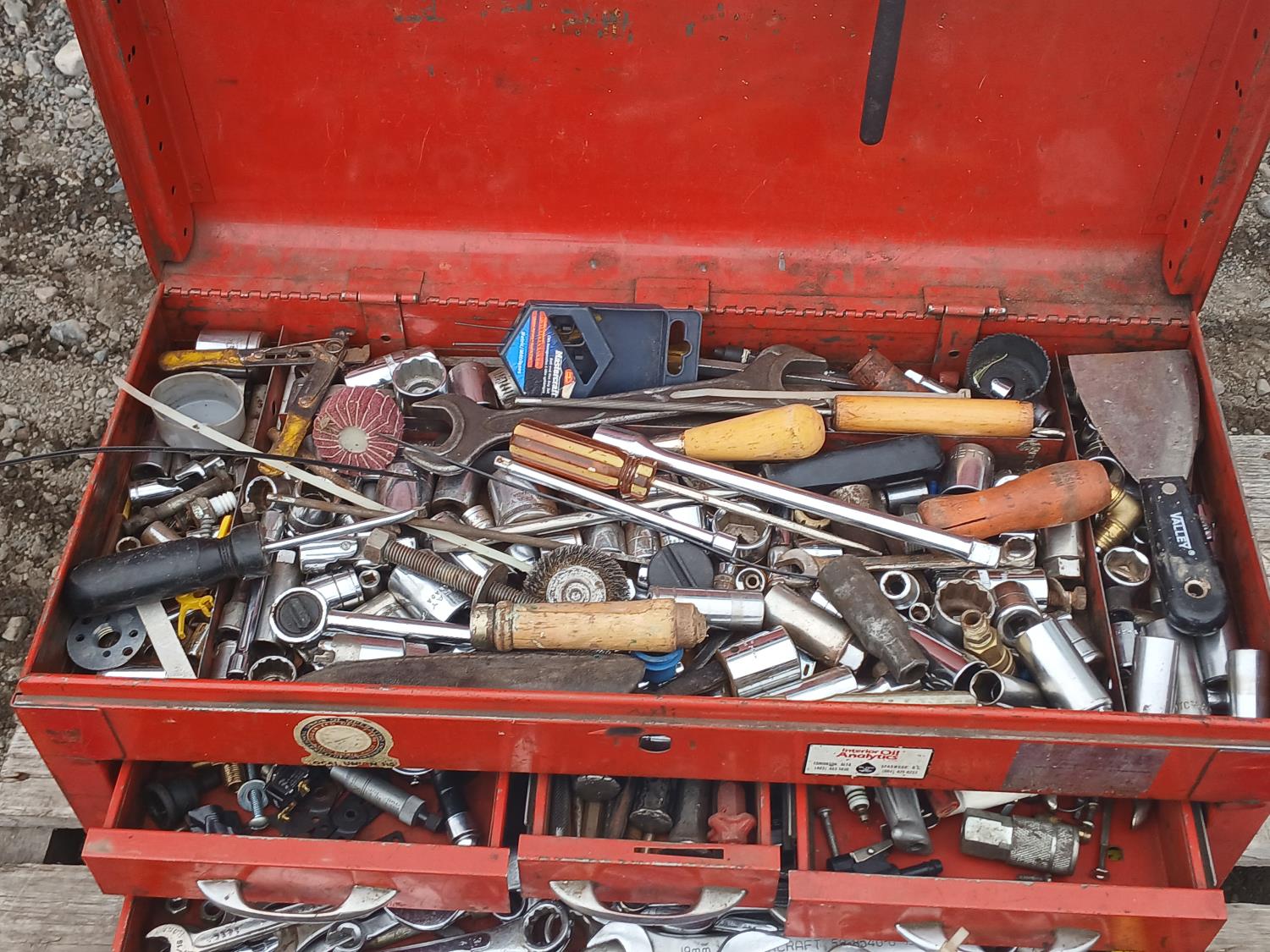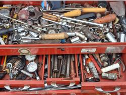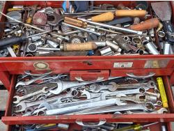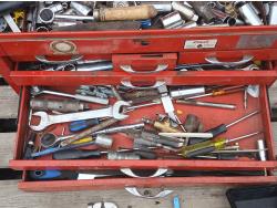 Multiple wrenches, sockets, files, screw drivers, pressure gauges, and various other tools, and accessories.