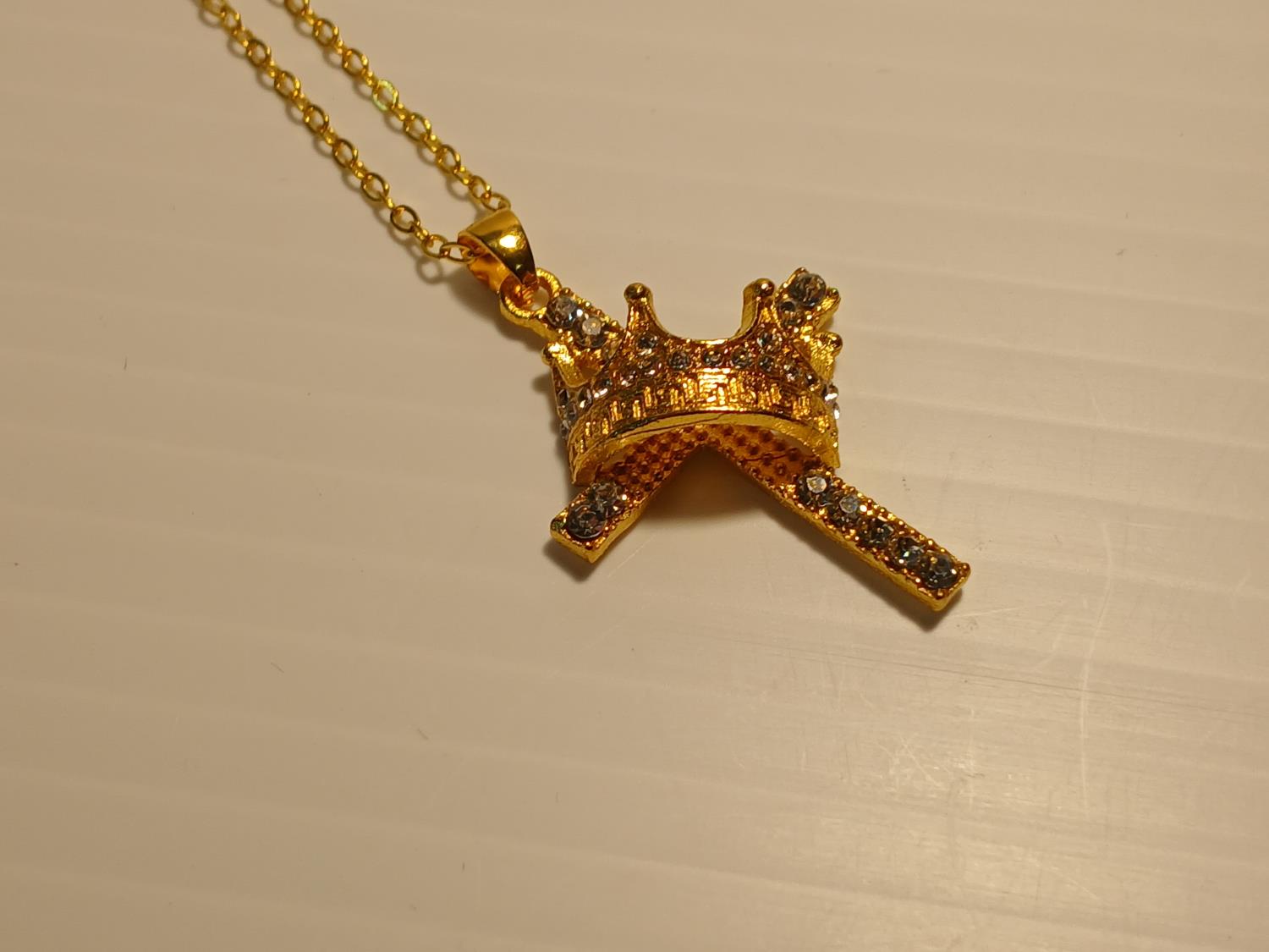 544 Gold Tone Cross and Crown Necklace (Unused)