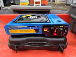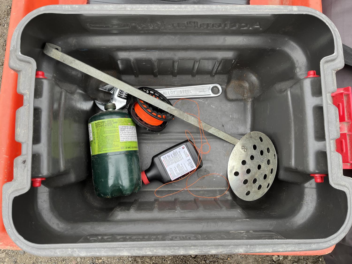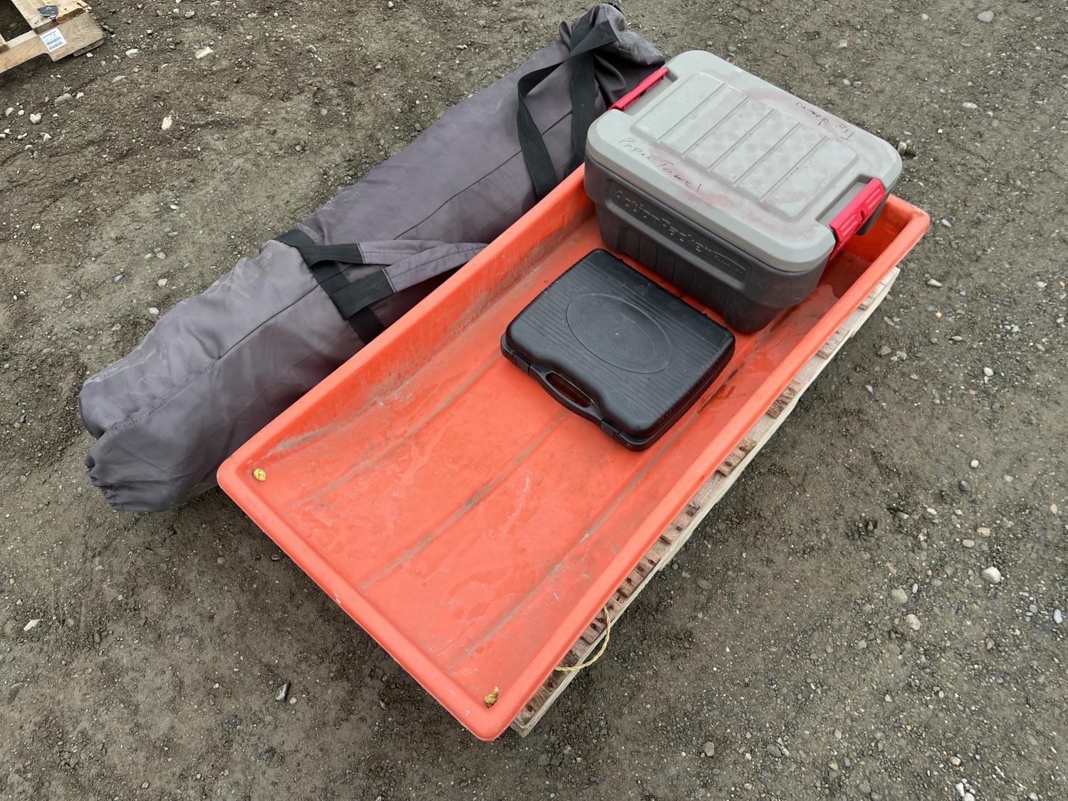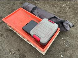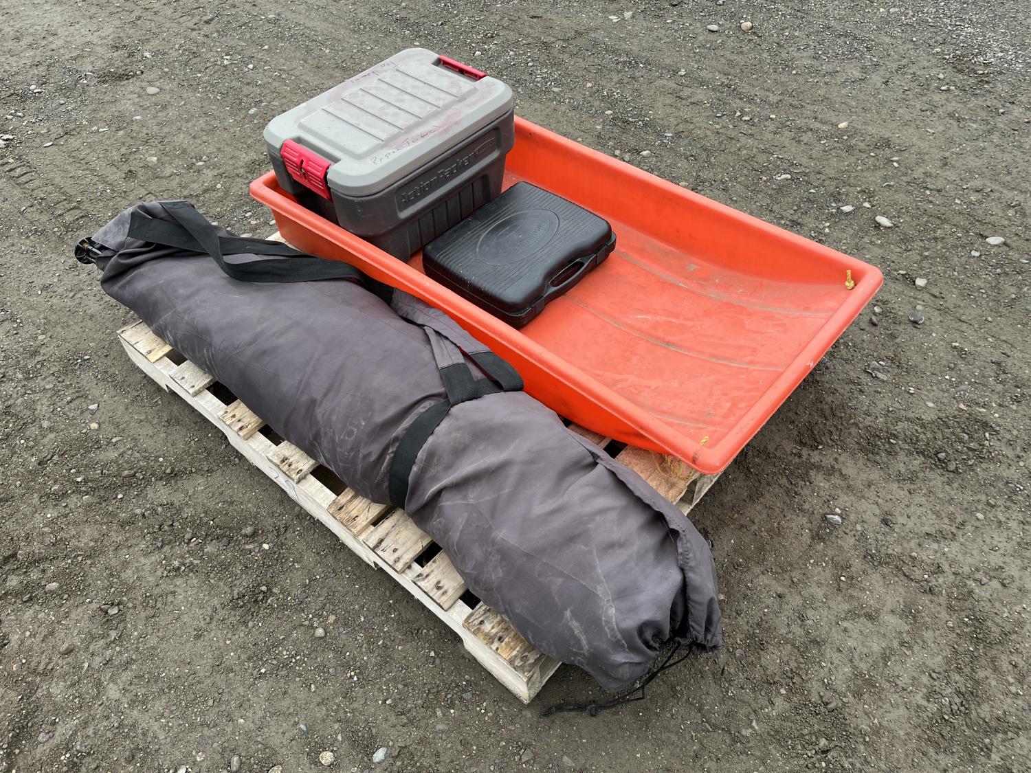 Portable ice fishing tent, equipment sled, Mr. Heater 3800 BTU portable propane heater, portable butane stove, (6) 2 stroke engine oil 10 litre mix