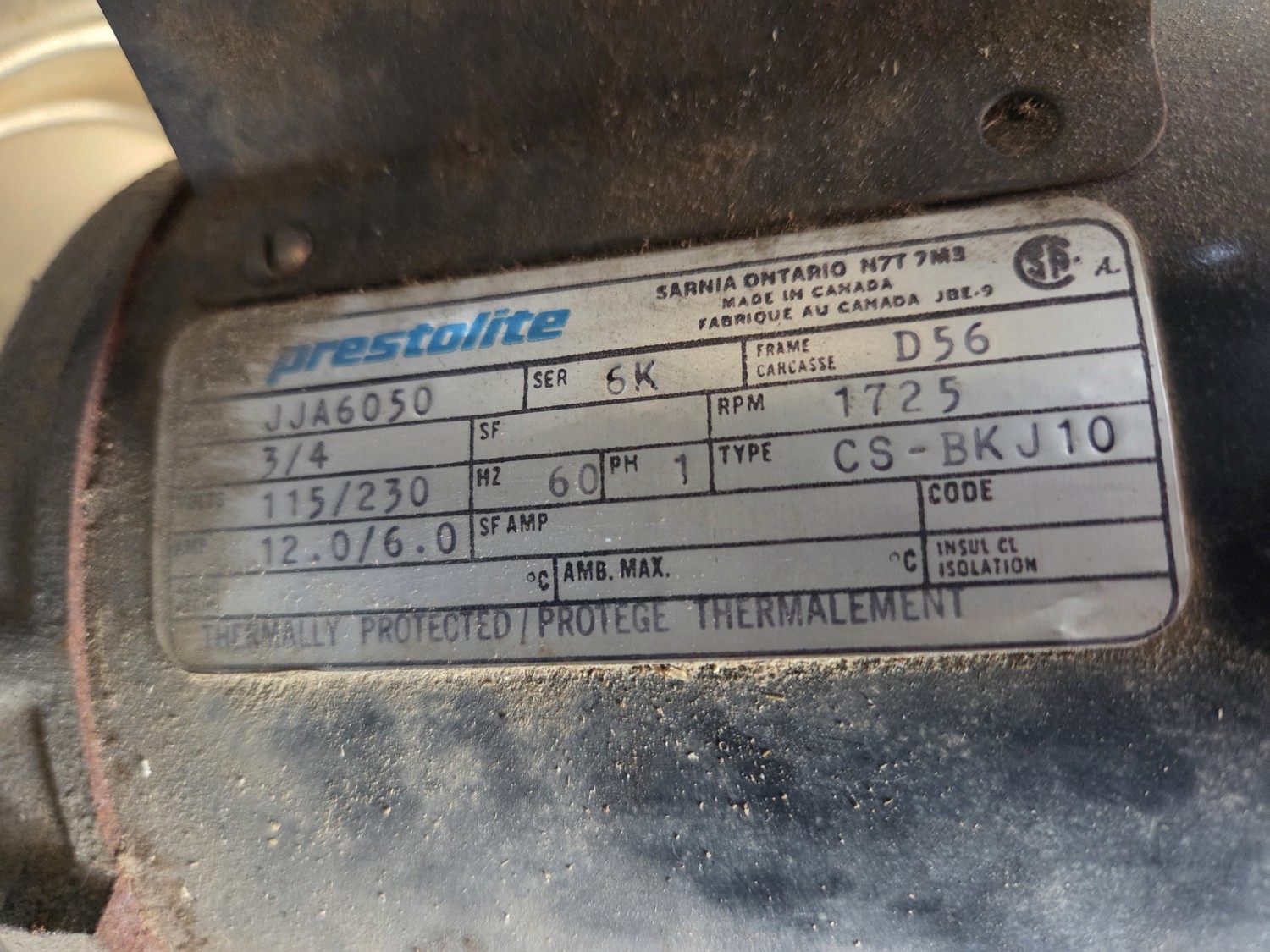 Prestolite motor: single phase, 60 Hz, 12.0/6.0A, 115/230V, 3/4 HP