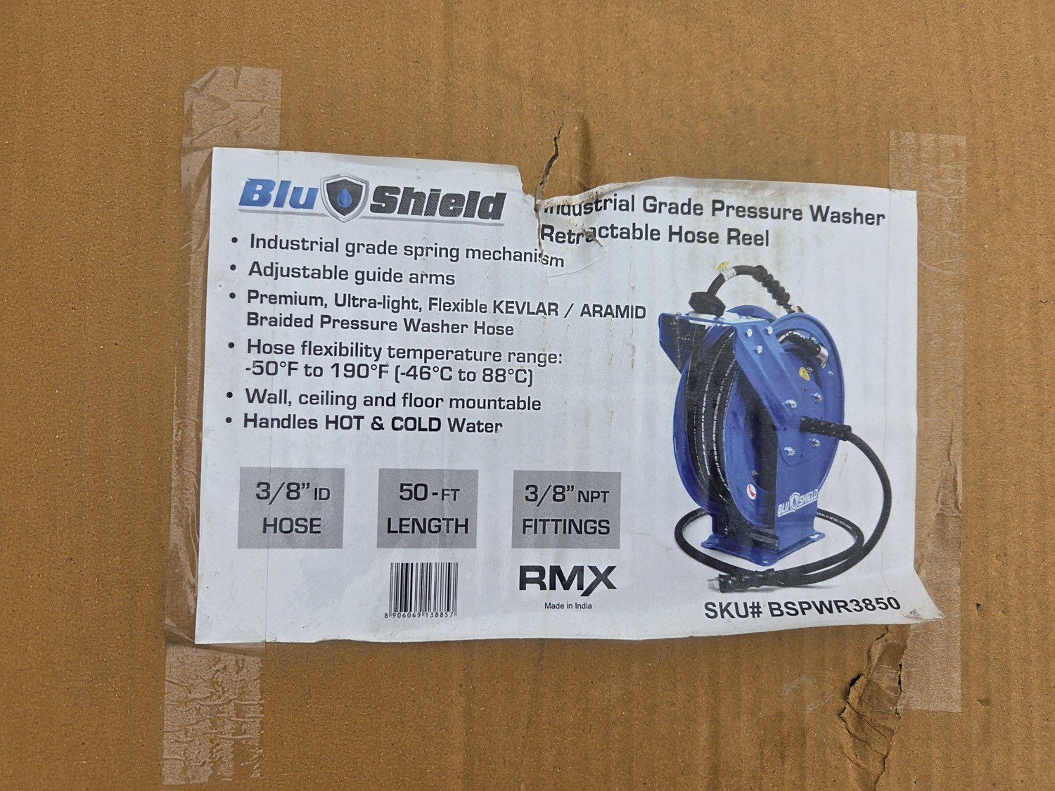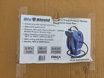 1361 BluShield Industrial Grade Pressure Washer Retractable Hose Reel and 50 Ft Hose (Unused)