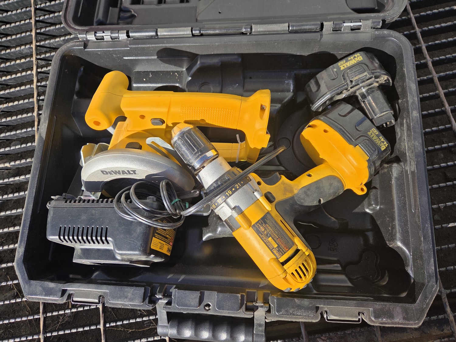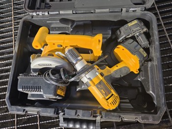 DW983 heavy duty 1/2 inch cordless drill driver, DW935 5-3/8 inch trim saw. Qty of (1) 14.4 V battery and charger included