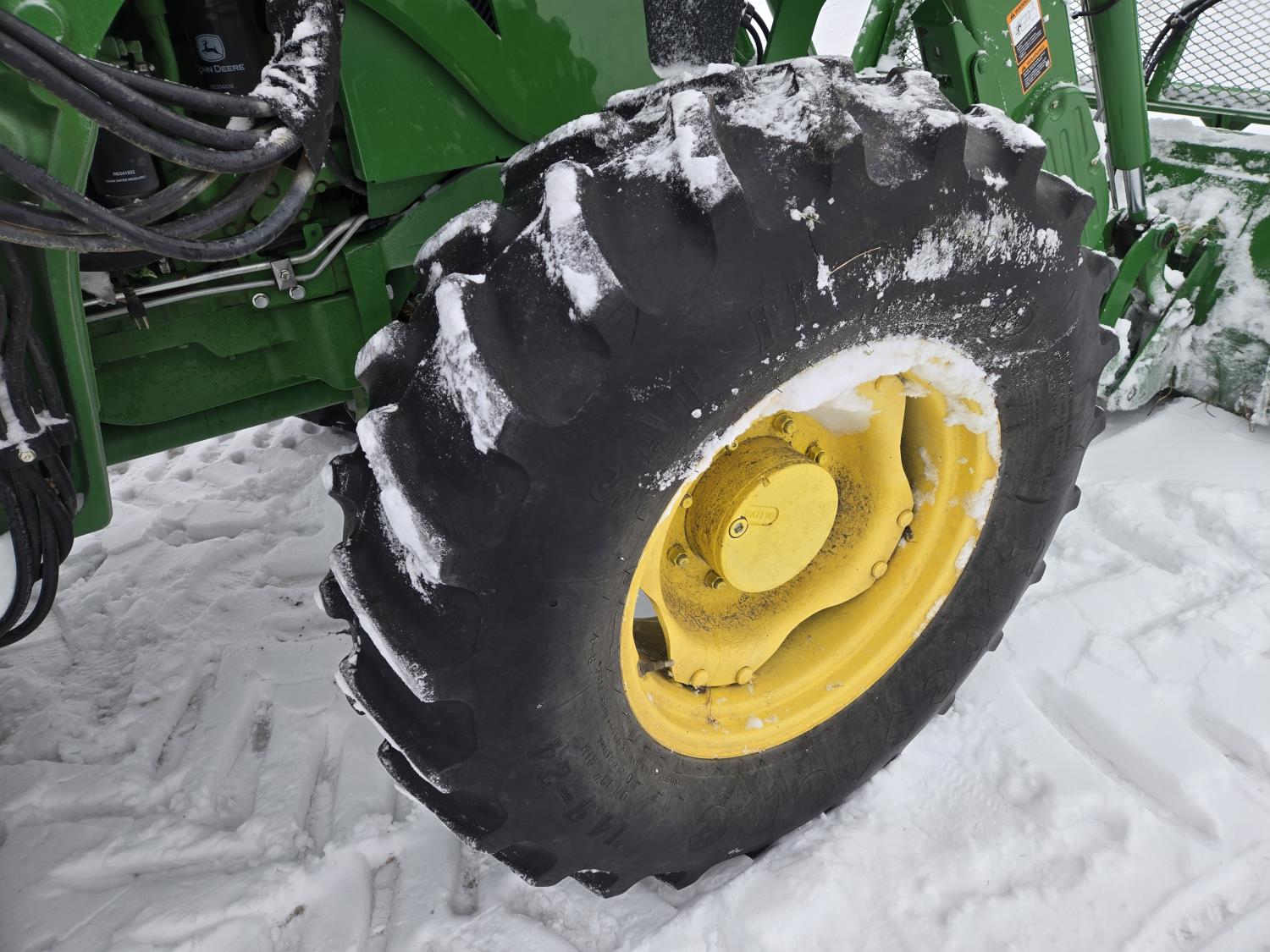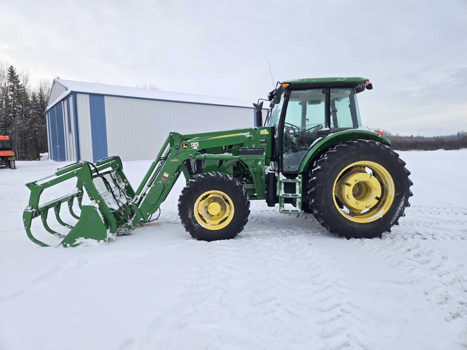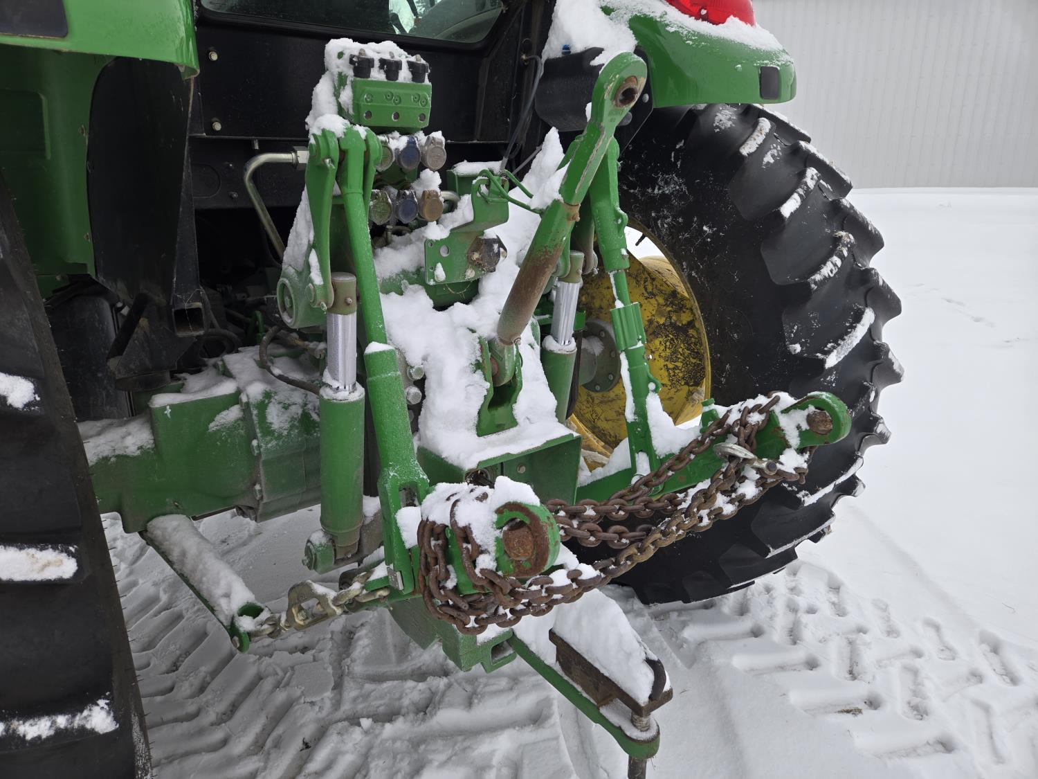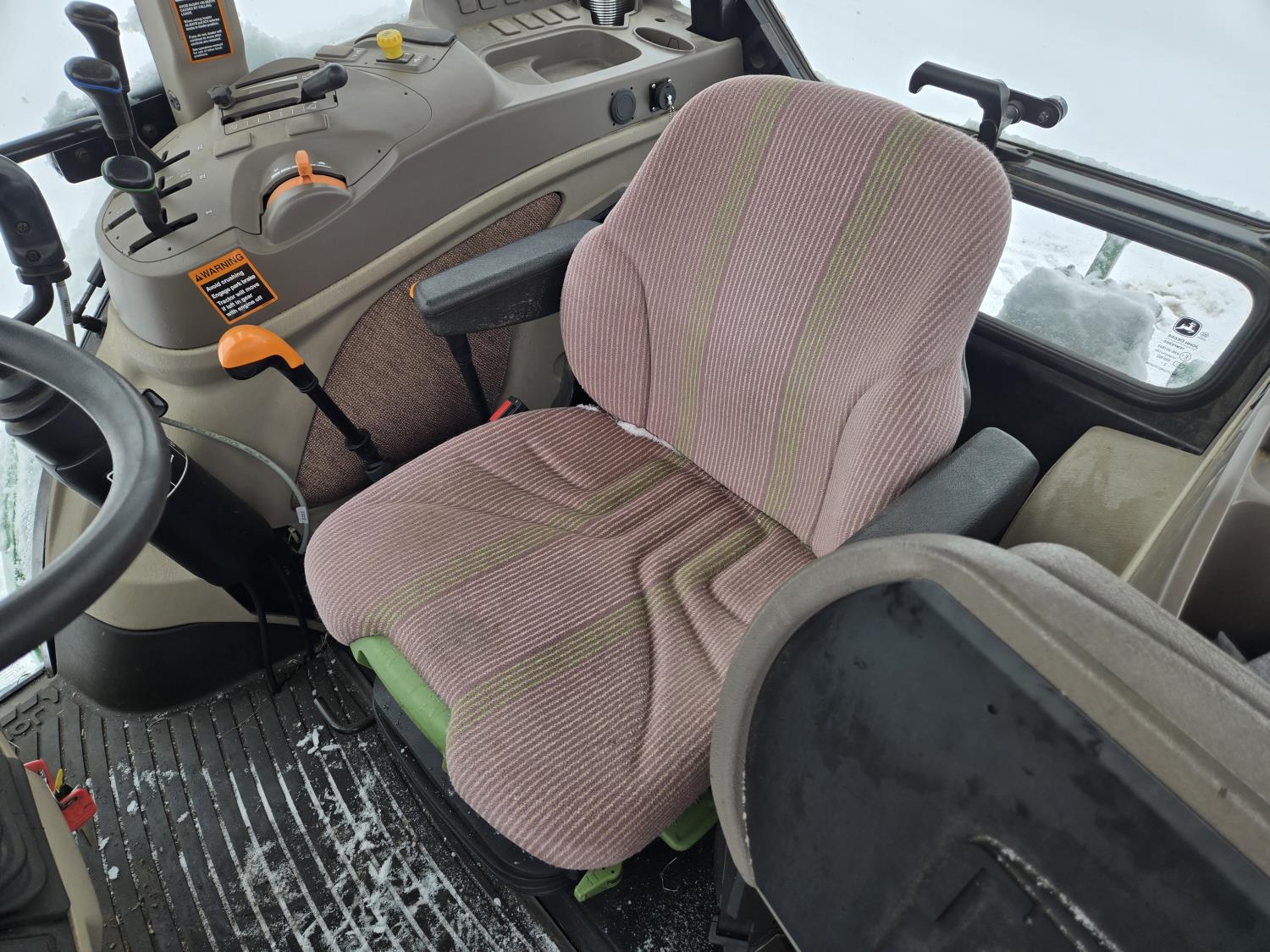 John Deere H310 loader, Q/A, 96 inch bucket, grapple, grill guard, mid mount hydraulic connection, John Deere 4.5 L 4 cylinder 137 HP, engine, 115 PTO HP, 9 speed partial synchro transmission, left hand power shuttle, cab, rear differential lock, joystick, A/C, radio, buddy seat, 540/1000 PTO, 3 point hitch, 3 rear hydraulic outlets, rear wheel weights, 14.9-24 front tires, 18.4-38 rear tires
