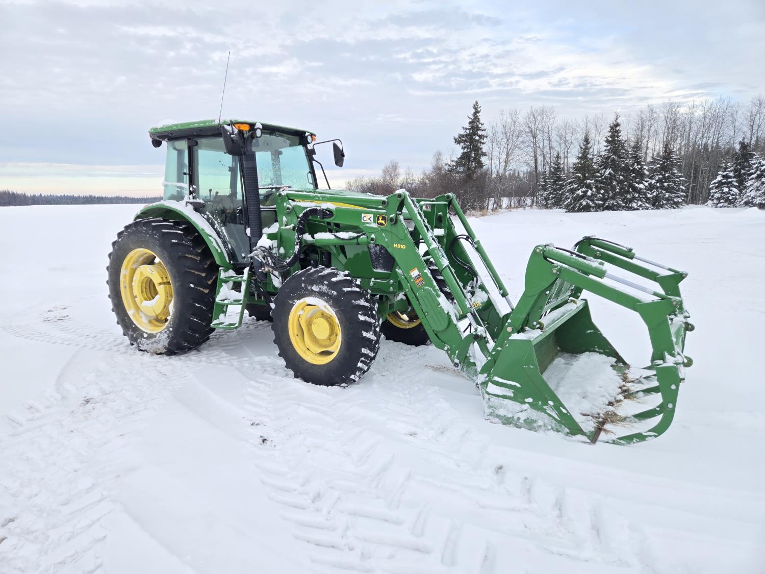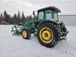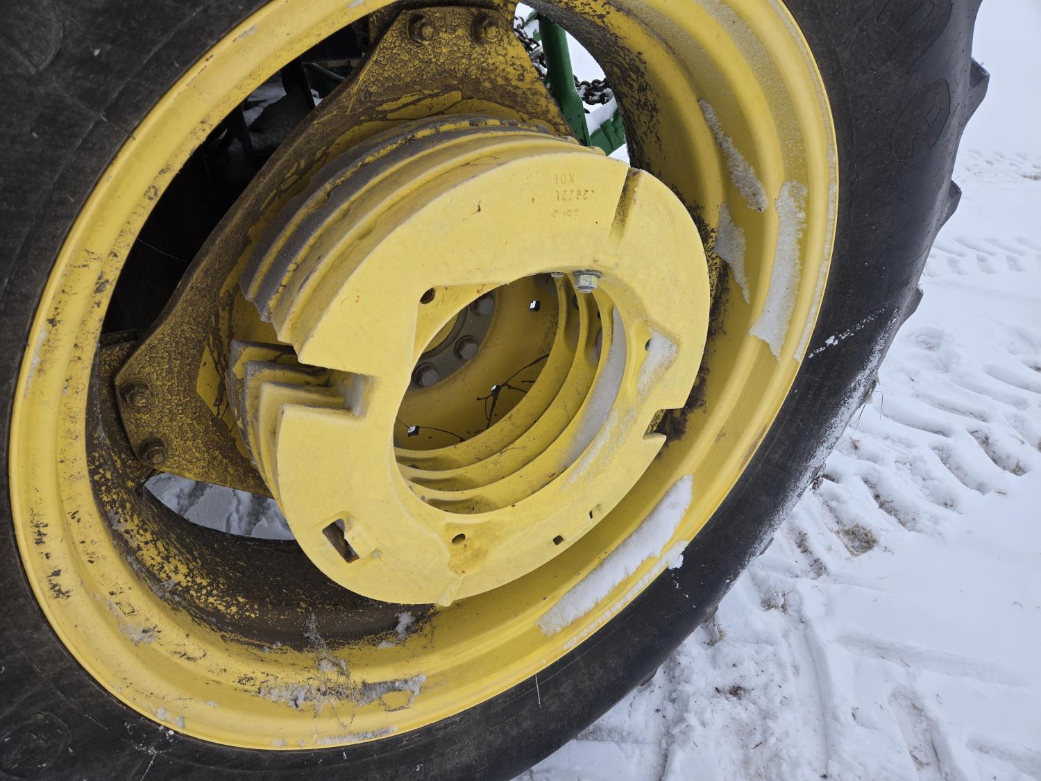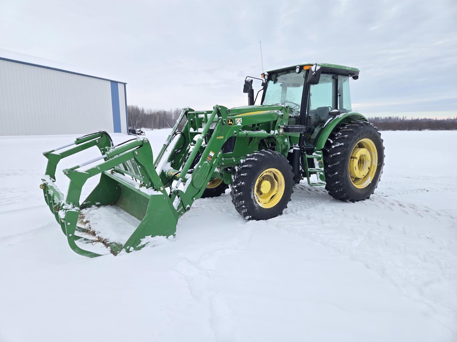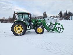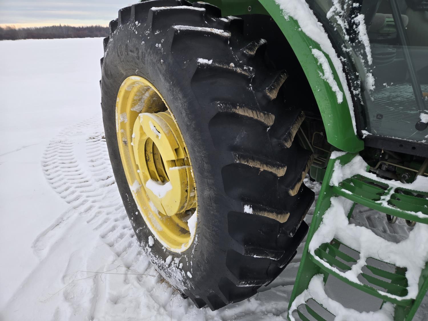John Deere H310 loader, Q/A, 96 inch bucket, grapple, grill guard, mid mount hydraulic connection, John Deere 4.5 L 4 cylinder 137 HP, engine, 115 PTO HP, 9 speed partial synchro transmission, left hand power shuttle, cab, rear differential lock, joystick, A/C, radio, buddy seat, 540/1000 PTO, 3 point hitch, 3 rear hydraulic outlets, rear wheel weights, 14.9-24 front tires, 18.4-38 rear tires