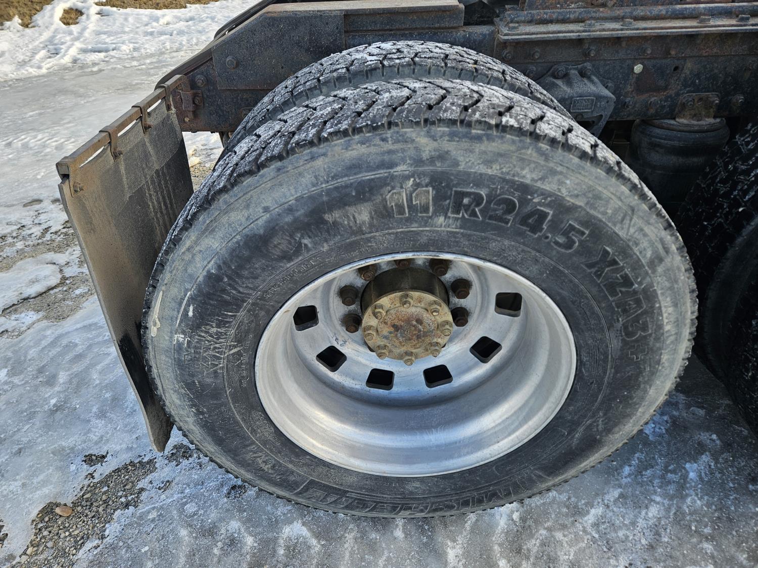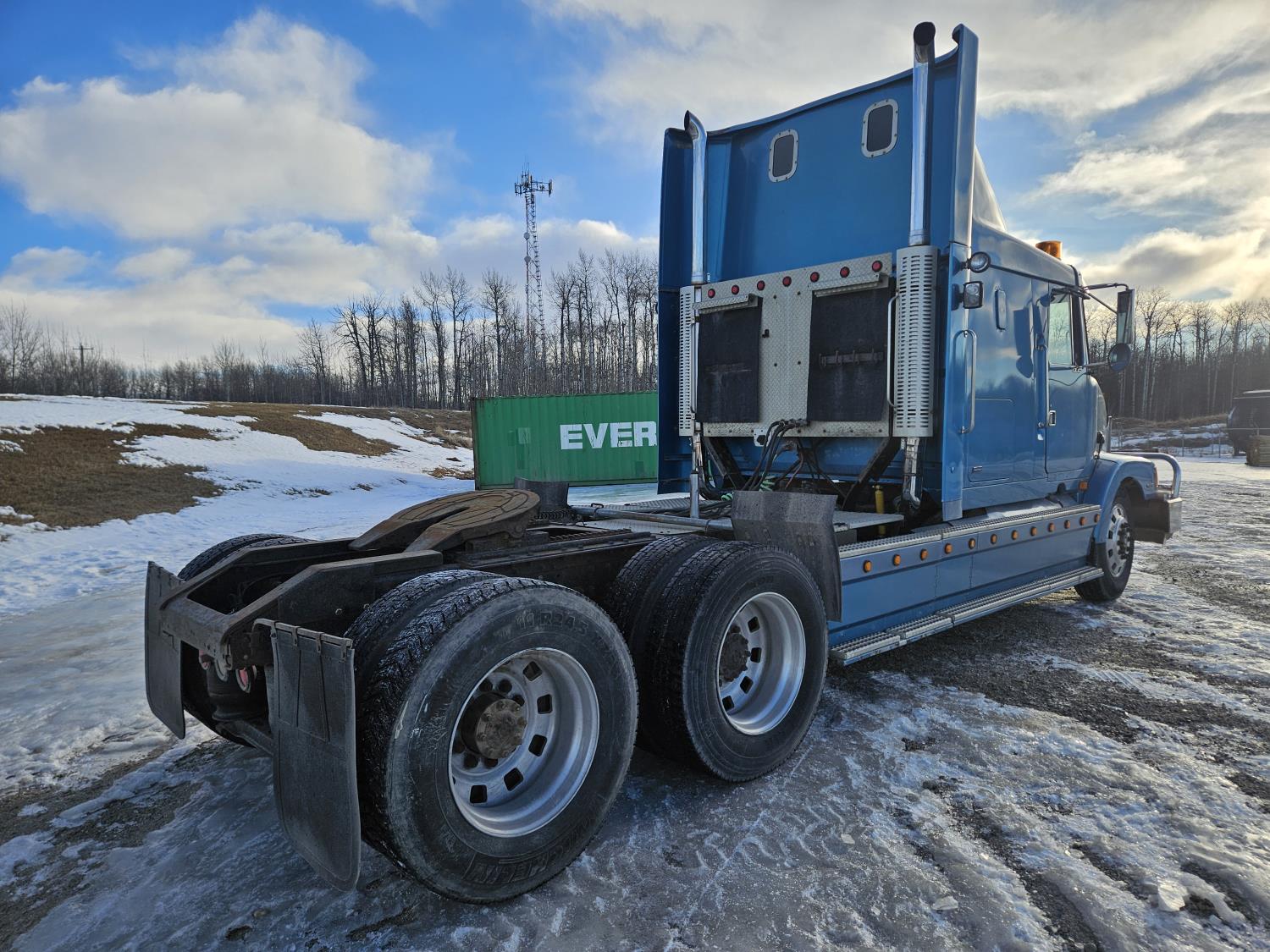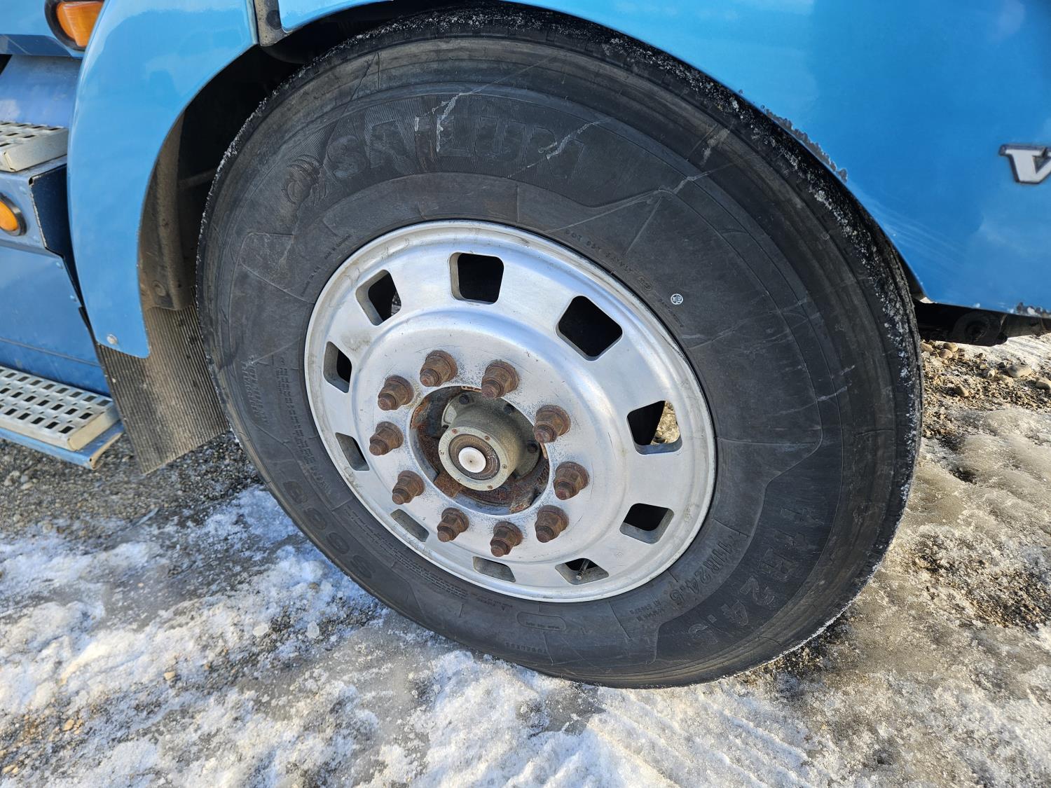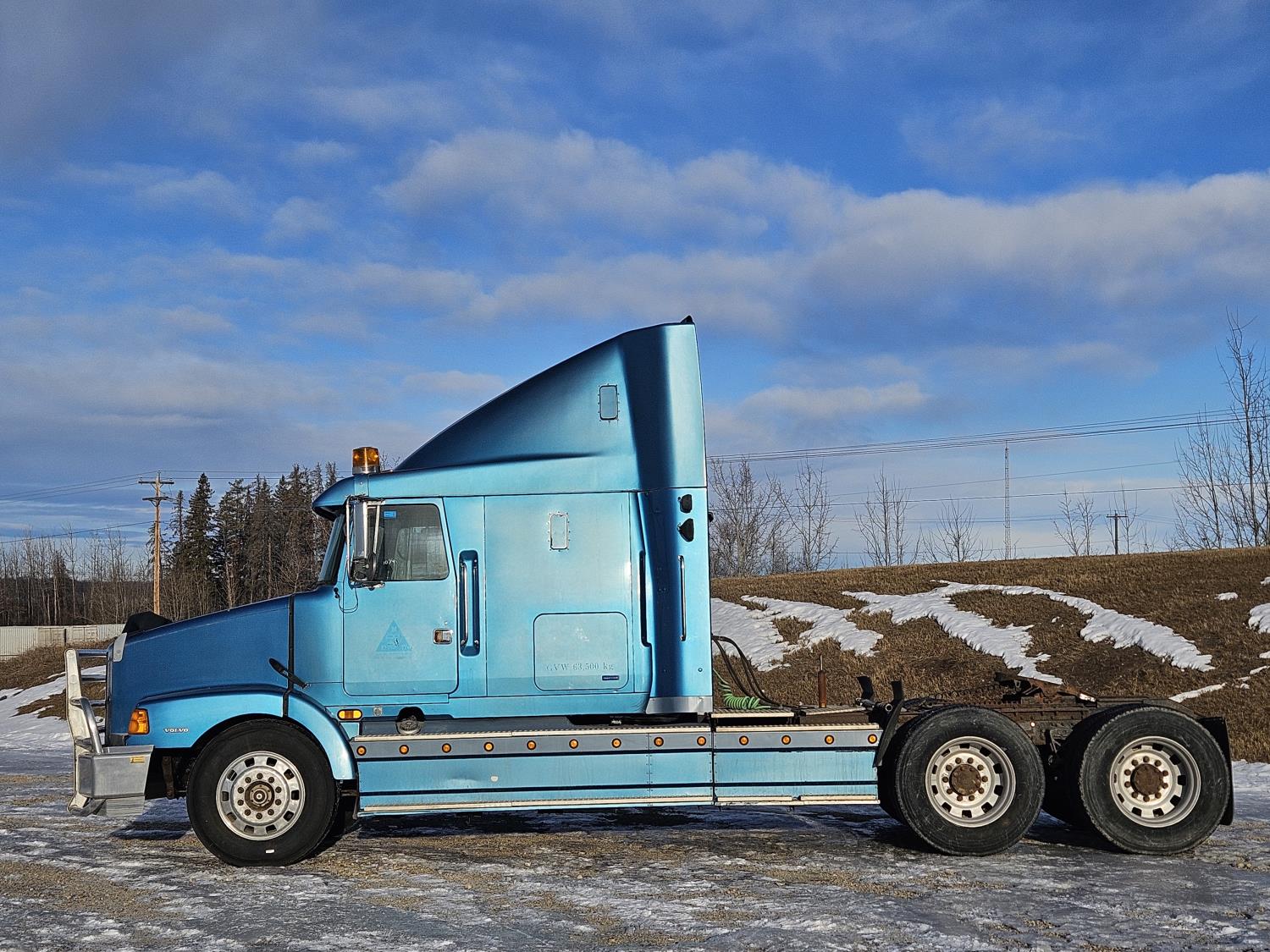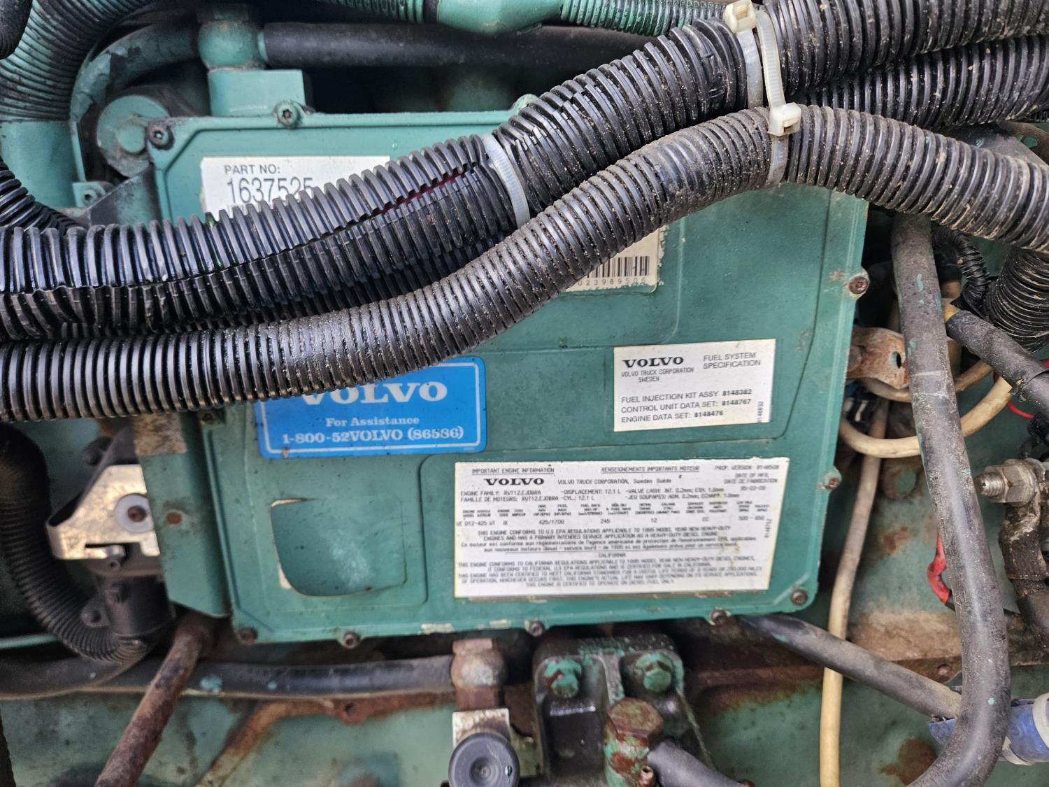 Volvo 12.1 L 6 cylinder 425 HP diesel engine, engine brake, Eaton Fuller VT 1414 14 speed manual transmission, high rise 52 inch sleeper, bunk beds, A/C, cruise control, air ride seats, aluminum moose bumper, aluminum headache rack, air ride suspension, 12,000 lb front axle, 40,000 lb rear axles, diff lock, super 40 rear ends, ECM issue when battery dies it resets the mileage, all aluminum wheels, 11R24.5 tires